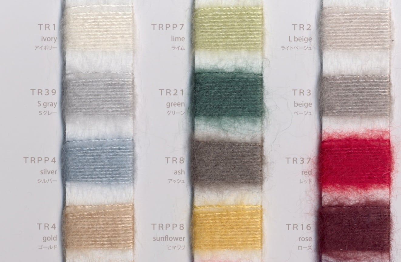 そのモヘアをタムタムヤーンに加工する際の芯になる部分にシルクを使用しています。モヘアの自然な光沢からのぞくシルクの強い光沢が、上品かつ高級感を演出し、豊かな表情を生み出しています。