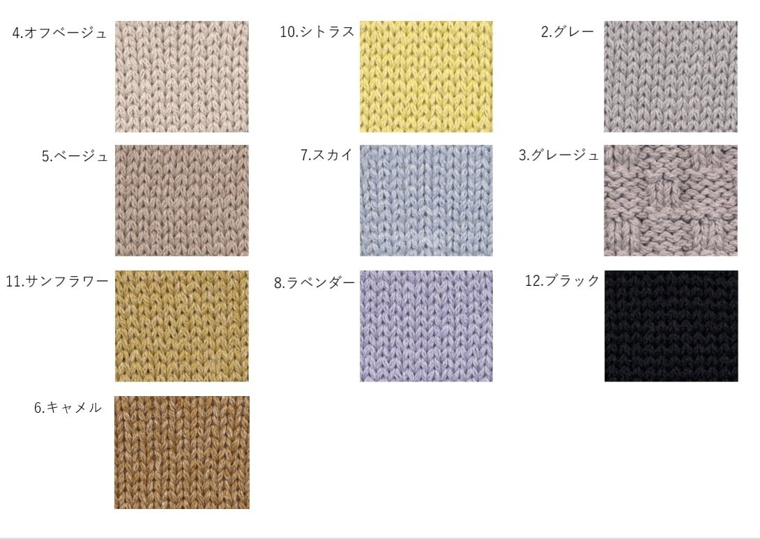 綿とウールをブレンドした糸をリリヤーンに加工したファンシーヤーンです。綿にはネップとよばれる小さな粒状の節がところどころについたナチュラルな雰囲気の糸です。秋から冬、春先まで長く重宝する風合いです。